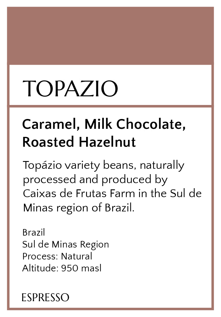Grown in Brazil’s renowned Sul de Minas region, these naturally processed Topázio beans from Caixas de Frutas Farm offer a smooth, comforting cup. Rich notes of caramel, milk chocolate, and roasted hazelnut create a sweet, nutty profile that’s both satisfying and easy to love—a true taste of Brazilian craftsmanship.